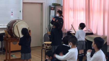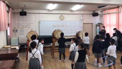 音楽室で大きな太鼓をたたくことができて子どもたちは大喜びです。