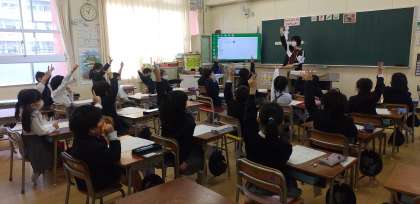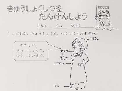 給食室では800人分の給食を作っています。調理する人の数は何人でしょう。という質問に答えたり、「きゅうしょくちょうりにん」という名前をひらがなで書いて覚えたりしています。