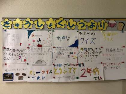 給食委員会が給食時間に放送をして、給食の歴史や栄養、こんだてについてのクイズを行いました。毎日当たり前のように食べている給食はいろいろな人の手によって作られています。感謝の気持ちで残さず食べましょう。