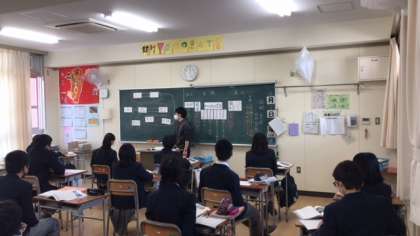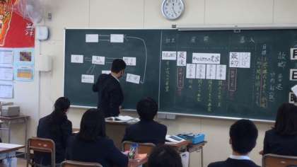 登場人物の関係図についてグループで議論し、代表生徒が発表していました。みんなで発表者をサポートしている雰囲気がすばらしかったですね。
