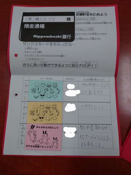 サンクスカードをもらった人は、Nippombashi銀行の信頼貯金通帳に記録していきます。