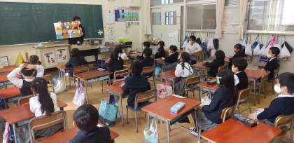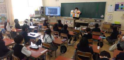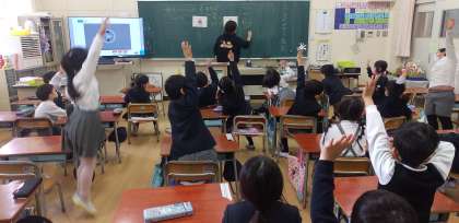 色や動物の絵を見て英語で発音しています。勢いよく手を挙げて答えています。