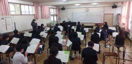 リコーダーを練習して一人ひとりの演奏を聴いています。静かな音楽室にリコーダーのかわいい音が響きます。
