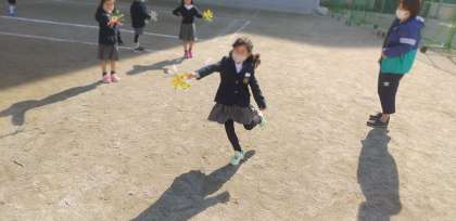 自分で作った風車。グラウンドで回してみます。