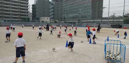 ペアになってボールをけります。思ったところに思って強さでサッカーボールをけり出します。