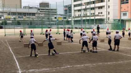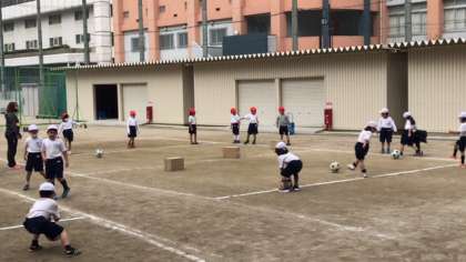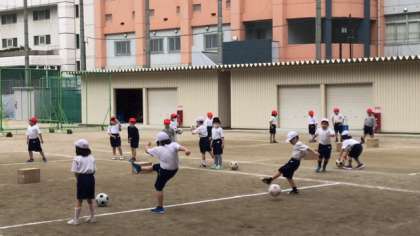 今日は段ボールめがけてボールを蹴って、相手陣地に段ボールをより多く押し込めたチームが勝ちというゲームで活動していました。