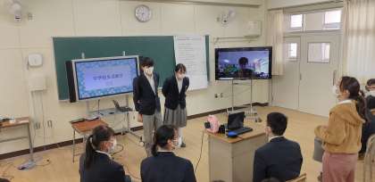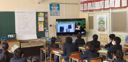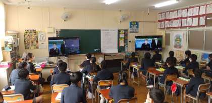 例年は直接話し合っていましたが、感染症拡大防止の観点から2つの教室をネットワークで繋いで、やり取りをしています。