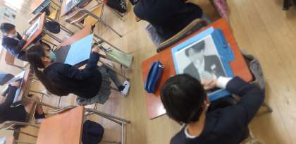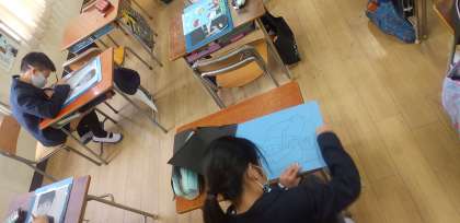 自分自身の写真を大きく引き伸ばし板に写していきます。カーボン紙を敷いて鉛筆でなぞると原画に写しだされていきます。
