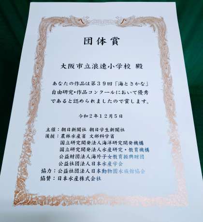第39回「海とさかな」自由研究・作品コンクールにて「学校・団体協力賞」を受賞しました。