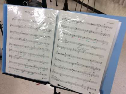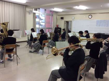 Our brass band has 15 students. We practice very hard every day. Now we have many new musical scores like Aladdin, March of Mickey Mouse, and March of Anpanman. We enjoy playing these famous songs.