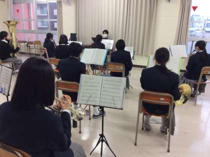 吹奏楽部には15人の部員がいます。毎日一生けん命練習に励んでいます。アラジンやミッキーマウス、アンパンマンのマーチのようなたくさんの新譜に取り組んでいます。みなさんがよく知っている歌をワクワクしながら演奏しています。