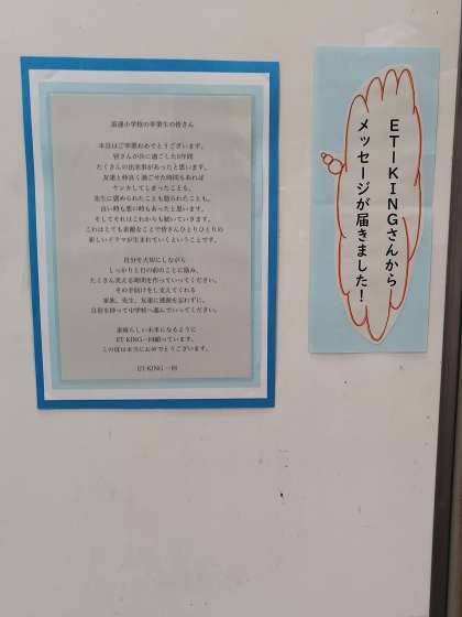 校長先生から卒業生に向けて、最後のメッセージです。本校の校歌についてです。校歌の歌詞の作詞に携わったET-KINGさんからもメッセージが届いています。