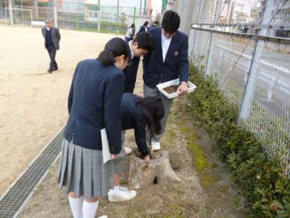 生徒のみなさんがグランドに出て、いろいろな場所で土を採取し、その土壌の小動物や土の状態を観察します。
