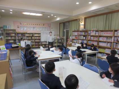 学校図書館補助員の桑山先生が図書室での過ごし方などのオリエンテーションをしてくださいました。みんな一生懸命にお話を聞くことができていました。