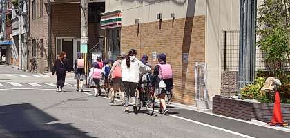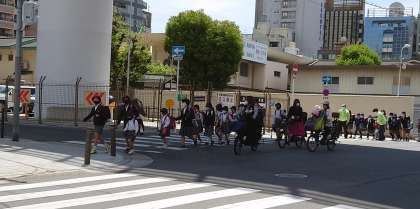 集団登校での一場面。