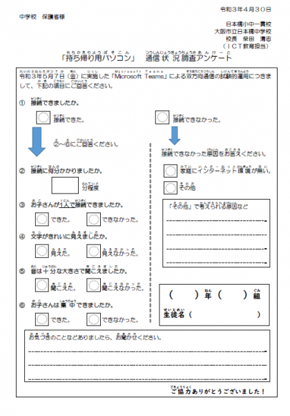 事前にお配りしております「通信状況調査」に、通信状況をご記入いただき、お子様を通じて学校にお持ちいただければありがたく思います。
