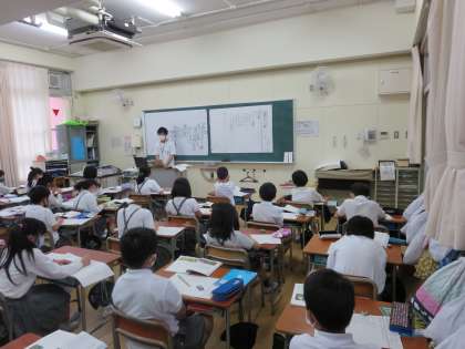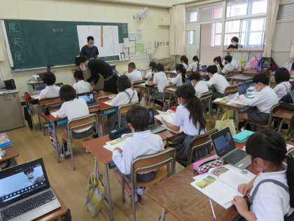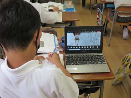3年2組で対面授業、1組でオンライン授業を同時進行しました。