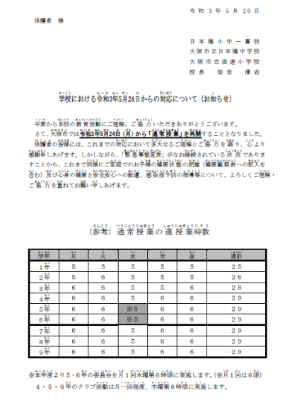これまでのご配慮に感謝申しあげるとともに、引き続き感染防止対策をしっかり講じながら教育活動を進めてまいります。