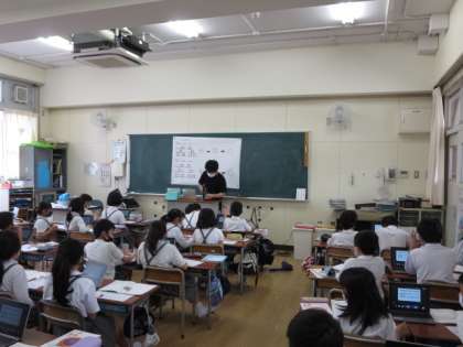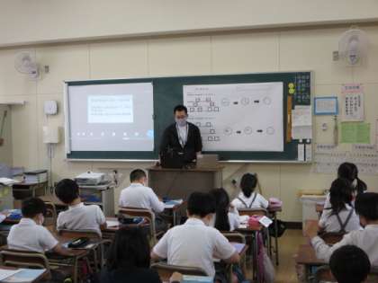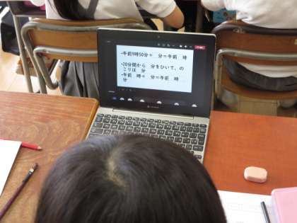 3年1組で対面授業、2組でオンライン授業を同時進行で行いました。タブレットのパワーポイントを使いながら、「時こくと時間」の学習を進めました。みんな集中して取り組むことが出来ていました。