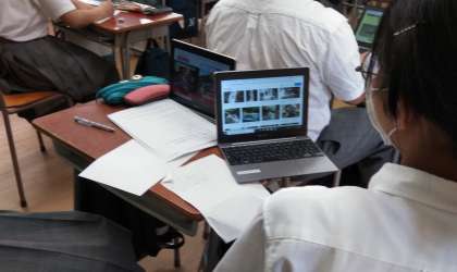 1年生は電子黒板を使って国語の授業、9年生は修学旅行に向けた調べ学習の様子です。