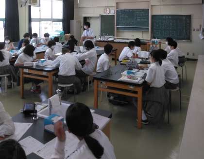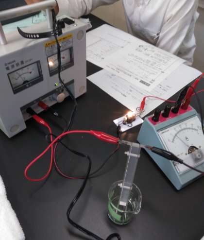9年生で理科の実験がありました。いろいろな水溶液の中で、電気を通すものと通さないものがあることを知るのが目的です。回路の組み立てから班で協力して、電球がついたときには喜んでいました。記録もしっかりととっていました。
