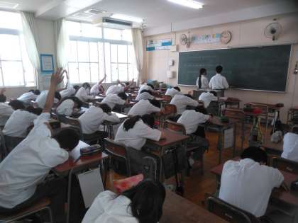 7年生は6時間目、教育相談を行いました。担任の先生と1:1で学校での様子を話する時間です。この間の待ち時間で、学級目標などを決めています。どういう目標にするのかそれぞれ意見を言い合い、委員長がまとめています。