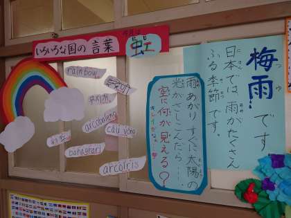 日本語指導教室の掲示では、いろんな国の言葉で「虹」を表現しています。