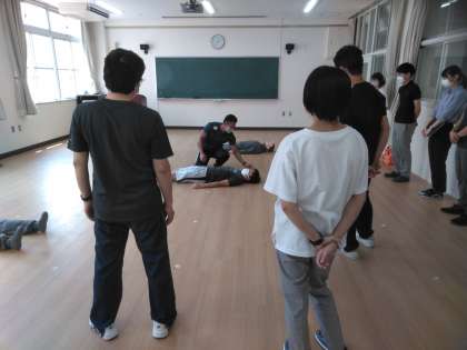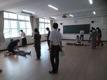 放課後、小中の教職員のための救急救命講習があり、本日は中学校の先生に向けての講習がありました。いざというときに備えて真剣に取り組んでいます。