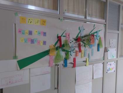 今日は七夕です。手作りの笹に、いろんな願いをこめた短冊が飾られています。