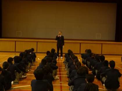 今日は、新転任教職員紹介の後、それぞれの学年の担任、副担任の発表などをし、生徒会から学校の紹介を行いました。