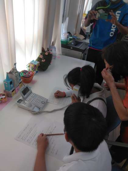 4年生で、青森県との交流会に向けて、地域の情報を集めようと電話で質問しているところです。非常にしっかりと聞き取り、記録できていました。電話の受け答えもすばらしかったです。