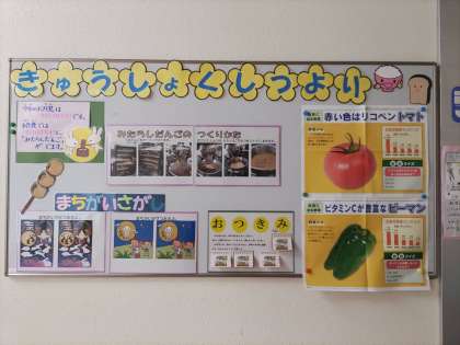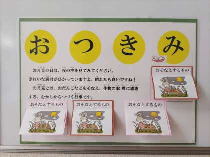 給食室の前の掲示板です。お月見の情報がのっておりクイズ形式で紹介しています。