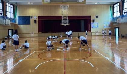 7年生の体育でバスケットボールの授業がありました。グループに分かれ難しいボールさばきの練習をしています。