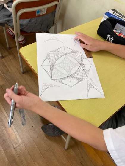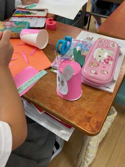 小学校2年生で1年生に向けておもちゃを作る授業と、中学校9年生の美術で点と面をつかったデザインの授業がありました。小中それぞれ、ユニークな作品が作られたり描かれていました。
