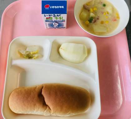そして、今月はアレルギーサポート月間でもあります。今日は米粉を使ったコーンクリームシチューで、小麦アレルギーがある人も食べることができます。シチューはどの学年にも好評で、よく食べていました。