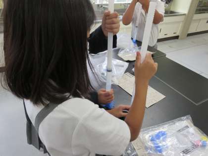 理科室で、注射器に水を閉じ込め、ゴムの板に注射器を直角に立てて真上からゆっくりピストンを押すと、閉じ込めた水の体積はどうなるか実験を行いました。