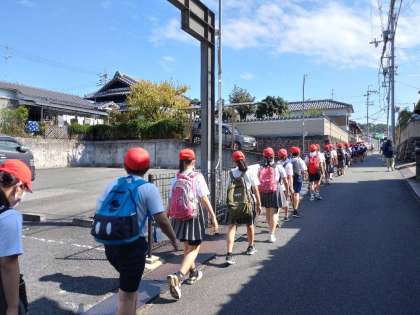 目的地の錦織公園までしばらく歩きます。細い道では、臨機応変に1列になる行動もすばやくします。
