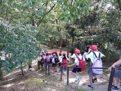 錦織公園に無事到着しました。自然に囲まれた公園で、児童たちも早く遊具などで遊びたいようすです。