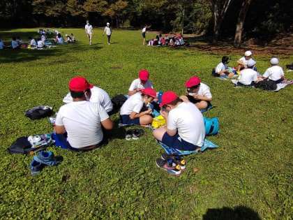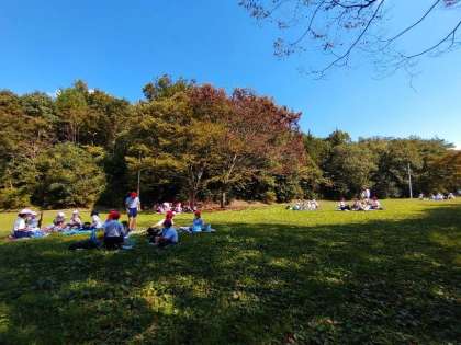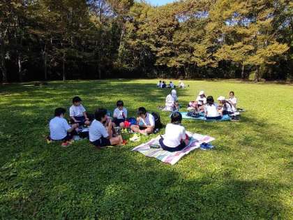 青空のもと、緑に囲まれ、美味しいお弁当を「いただきます」と元気よく感謝を伝え食べ始めました。