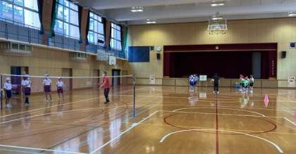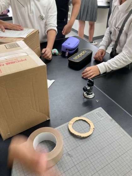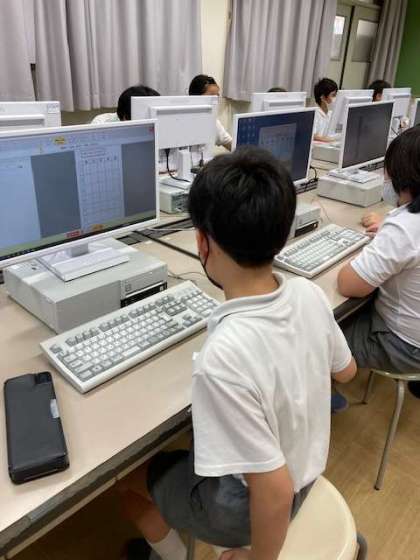 体育館でのスポーツ、実験で空気砲作成、パソコンで時間割作成のようすです。