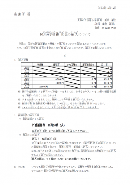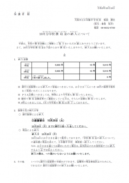 小学校と中学校の10月分の学校徴収金のお知らせです。ご確認ください。