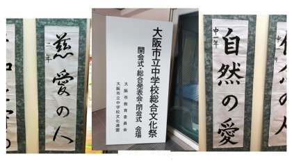 続いて、昨日行われました大阪市立中学校総合文化祭に出展した作品に賞を頂いたので教頭先生から披露していただき、賞状を渡していただきました。