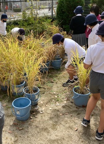 5年生でバケツ稲つくりというものを取り組んでおり、稲刈りをしてもらった後、役割分担して干している様子です。なかなかできない体験に積極的に参加できていました!