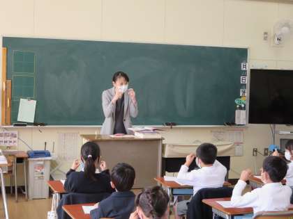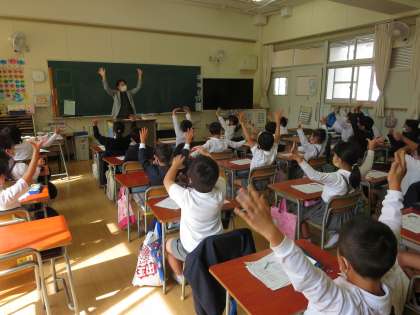 図書館補助員の先生が、教室で手話うたの「にじ」の指導をしてくださいました。子ども達は先生のお話をよく聞いて、熱心に手話うたの練習をしていました。また、手話での「こんにちは」や「ありがとう」なども教えて頂きました。