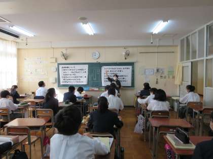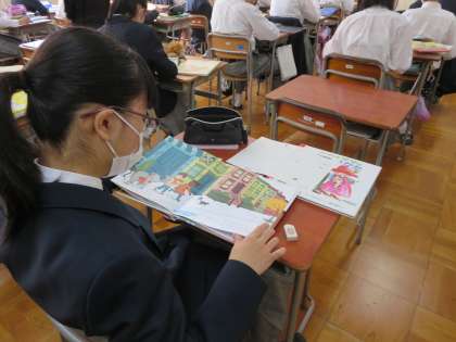 上級生が下級生に向けて、おすすめの絵本を紹介する「読書郵便」を実施します。今日は7年生が3年生に向けておすすめの絵本を選び、その絵本のおすすめポイントなどを葉書に書いています。