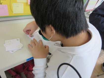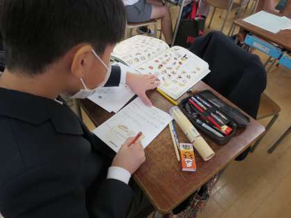 今日は5年生が2年生に向けて、おすすめの絵本を紹介する葉書を作成しました。