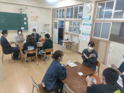 放課後実施した若手教職員研修では、本校に設置している日本語教室で疑似体験ゲーム「バーンガ」をしました。