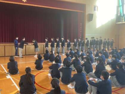 中学校の全校集会の様子です。校長先生から本気で取り組む大切さのお話がありました。これからの学校生活でも本気で取り組み、貴重な経験してほしいと思います。その後、認証式がありました。それぞれの委員でまた後期の活躍を願います。