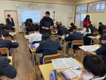 7年生で美術の時間にレタリングでオリジナルの絵文字を作成する取り組みがありました。各自が選んだ漢字の由来などを考え、ユニークな絵文字ができていました。