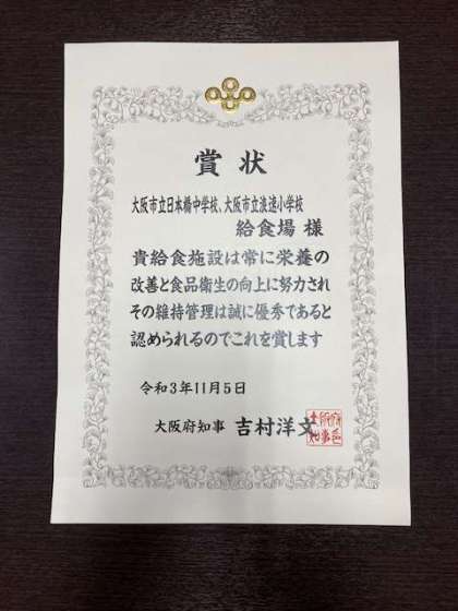 本校の給食室の職員の皆さまのご尽力により、給食室知事表彰を授かりました。日頃の衛生管理はもちろん、いつも美味しい給食を調理してくださり本当にありがとうございます。大阪府知事からの表彰ということで大変すばらしいことですし、これからも感謝の気持ちを忘れず給食をいただきたいと思います。